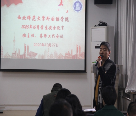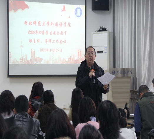 会上,学生工作负责人首先向班主任及导师针对近期学生工作安全教育相关事宜从安全教育方面、校园防疫方面、校纪校规方面、重点关注学生方面、毕业生就业方面做了具体的工作部署。第一、要严把学生安全关;第二,疫情期间要对学生实行网格化管理;第三、要让学生严格遵守请假销假制度;第四,要深入摸排需重点关注学生,做好学生的心理辅导;第五,要及时跟进学生的动态,了解学生就业意向,鼓励学生积极就业。