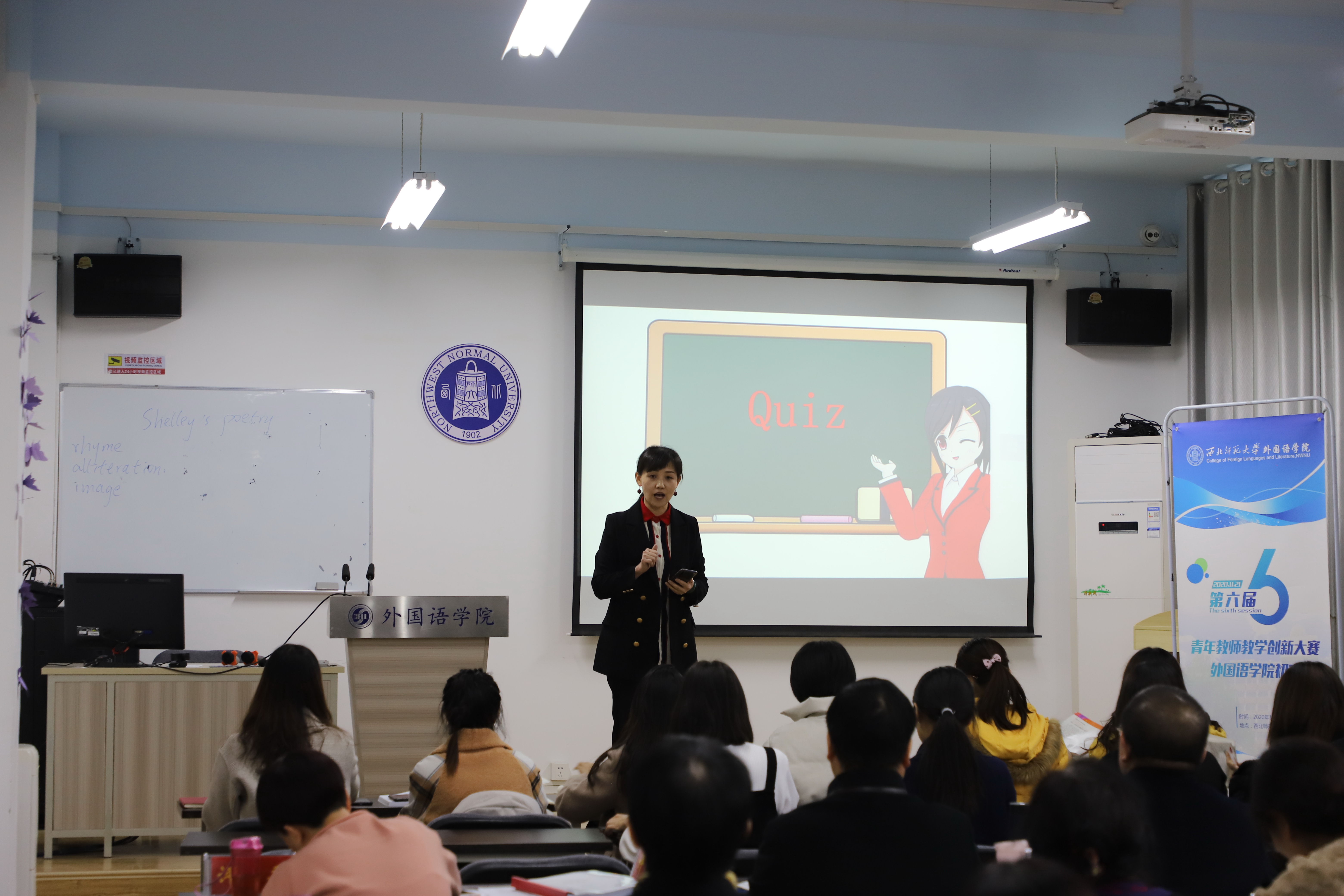 比赛于上午8:00开始,全天分为上午、下午两场,上午场8:00-12:00进行,下午场2:00-6:00进行。比赛中,各位参赛教师围绕外语课程的教学特点,积极探索创新,运用长江雨课堂等各种网络教学手段,将现代化信息技术与教学深度融合,为大家呈现出一场精彩纷呈、充满活力的比赛,各位选手多角度、全方位地充分展示出了我院教师独特的教学风采。