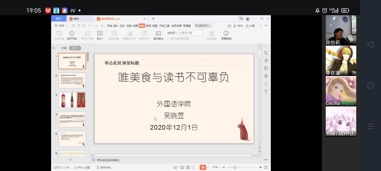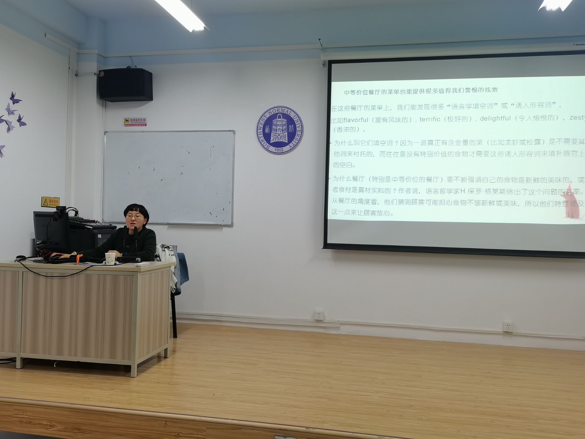 2020年 12月1日晚7:00,yl6809永利于教学三号楼806室开展了“益”周读书系列读书会第三十讲。本次读书会主题为“唯美食与读书不可辜负”,采用“线上+线下”的方式举办,参与人数近120人,主讲人吴晓昱副教授为同学们分享了《食物语言学》。