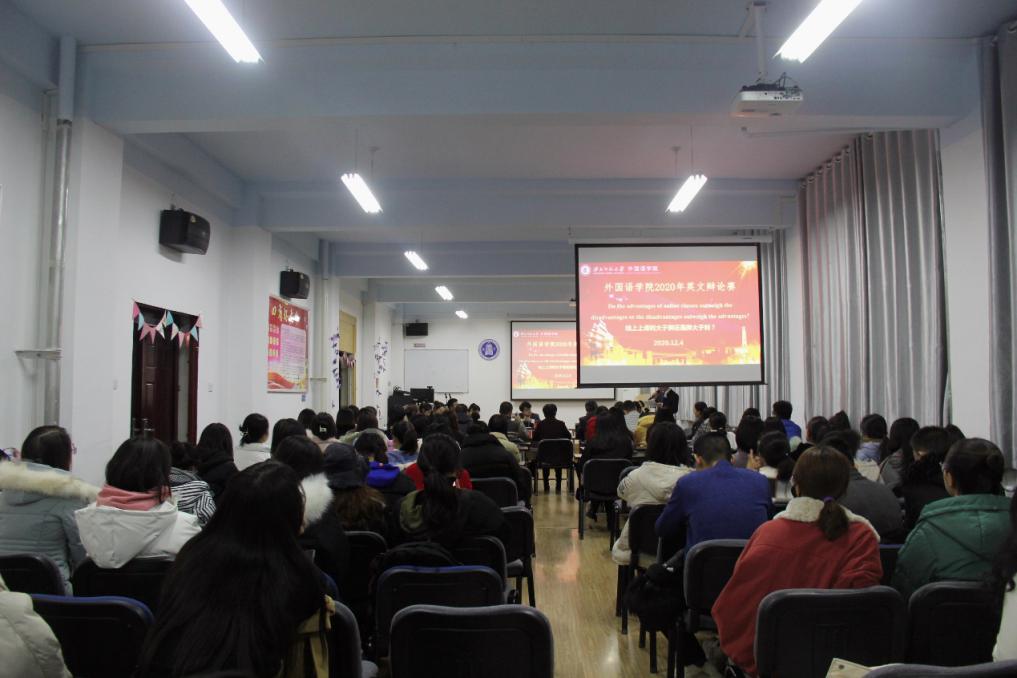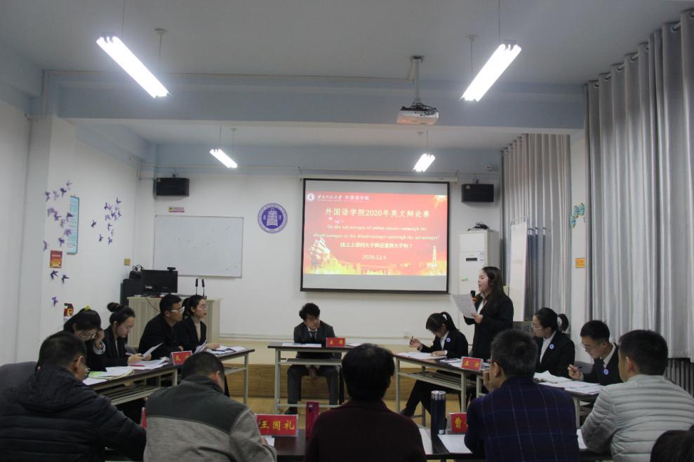 2020年12月4日晚,我院在教学3号楼806教室成功举办研究生英文辩论赛(决赛)。在初赛中脱颖而出的2020级学科教学(英语)和英语口译两支研究生队伍参加了此次比赛,就“Do the advantages of online classes outweigh the disadvantages or the disadvantages outweigh the advantages?”的辩题展开了激烈辩论。本次比赛邀请了王琦教授、曹依民副教授、宁振业副教授、王国礼副教授以及郭亚文副教授担任评委,2018级口译班李建超担任决赛主席,2020级全体翻译硕士和学科教学(英语)1班教育硕士观看了本次比赛。