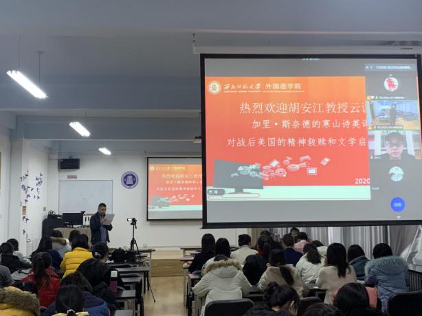 2020年12月10日下午,学院特邀四川外国语大学胡安江教授在线为我院师生作了“加里·斯奈德的寒山诗英译对战后美国的精神救赎和文学启蒙研究”的学术讲座。本次讲座由我院王国礼副教授主持,学院2019级部分学术型硕士、翻译硕士、教育硕士及2020级全体课程与教学论专业研究生聆听了此次讲座。