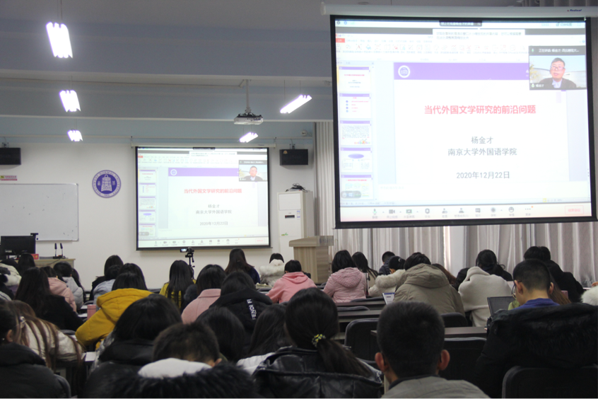 2020年12月22日下午,学院特邀南京大学博士生导师、教育部“长江学者”特聘教授杨金才云端为我院师生作了题为“当代外国文学研究的前沿问题”的学术讲座。本次讲座在教学3号楼806室举行,由副院长俞婷教授主持,学院部分教师、外国语言文学专业与课程与教学论专业研究生、翻译专业硕士、学科英语专业硕士聆听了此次讲座。