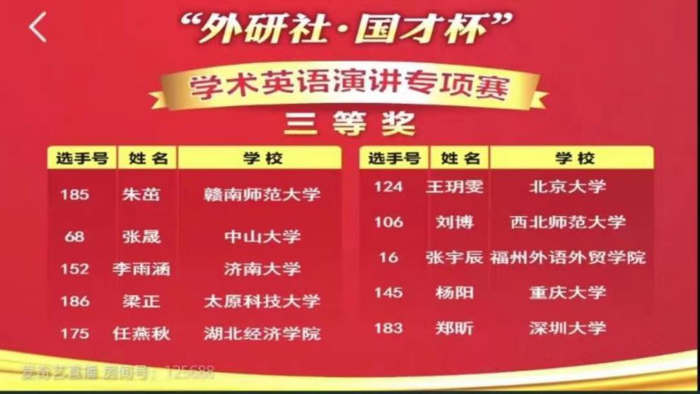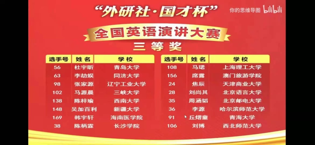 2020“外研社·国才杯”全国英语演讲大赛及2020“外研社·国才杯”学术英语演讲专项全国总决赛于12月14号至20号在线上举行,从全国各地晋级决赛的演讲选手云端逐鹿带来了较以往更加激动人心的特殊比拼。代表甘肃省参加此次总决赛的我院2019级刘博同学,以优秀的表现获得了此次演讲大赛和学术演讲大赛全国总决赛三等奖。同时,我院郭亚文老师获全国决赛指导三等奖。