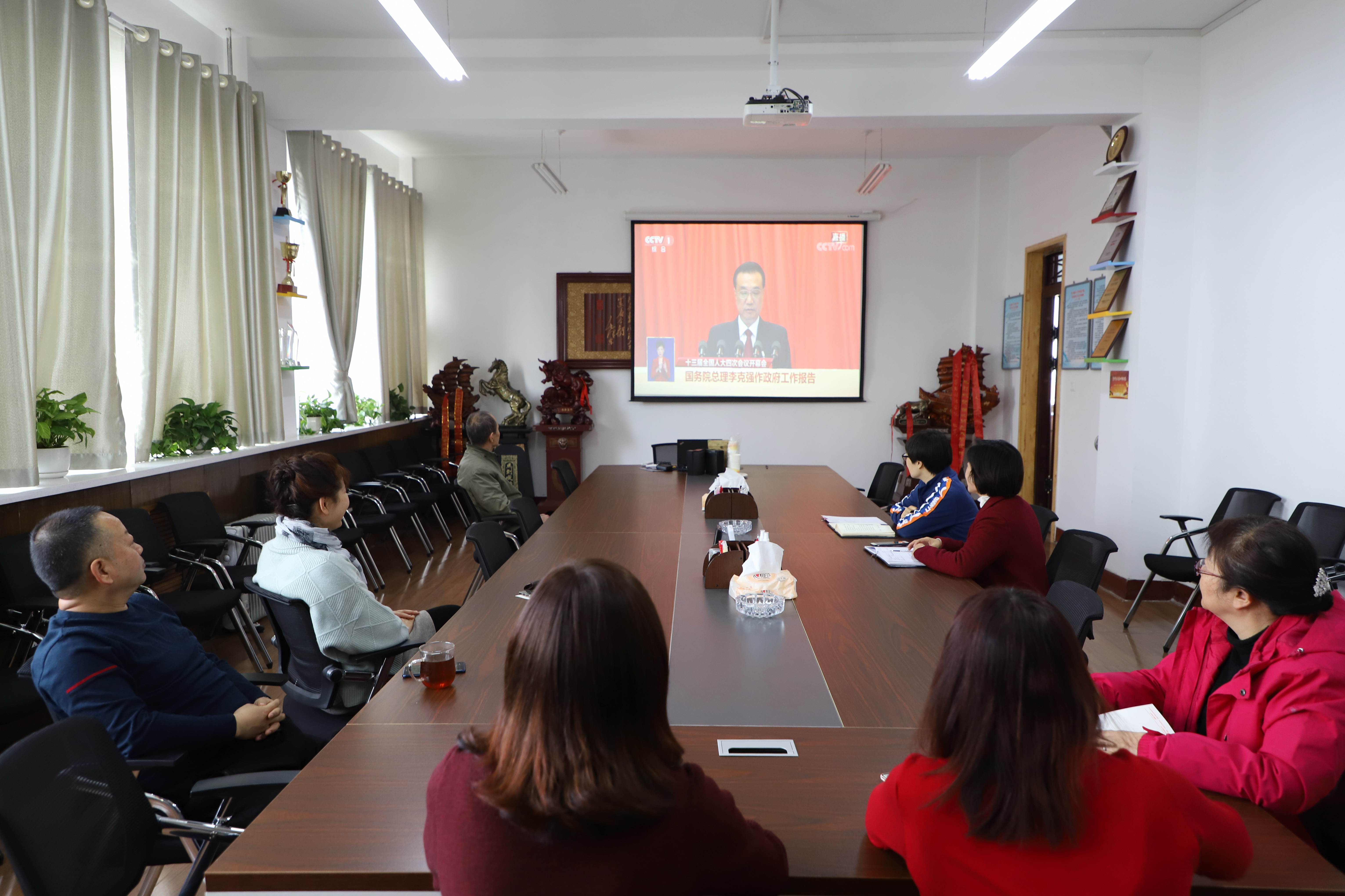 师生们认真收看开幕会上李克强总理所作的《政府工作报告》。