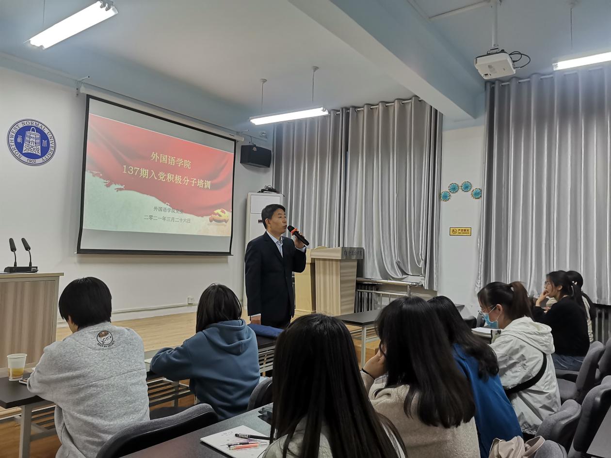 开班式上,学院党委书记王景以“坚定理想,积极争取加入中国共产党”为题作了培训动员,希望全体学员遵守培训纪律,严格要求自己,认真学习培训,不断增进对党的宗旨和党的基本知识的了解掌握,以实际行动积极向党组织靠拢。学院党委副书记朱晓娟作了《网络意识形态的挑战与应对》的专题辅导,就新时代大学生如何正确认识网络意识形态、如何做好安全应对等作了详细解读;教工第二党支部书记吴晓昱老师结合回顾党的百年发展历程,作了《提升专业能力,传承红色精神》党课辅导,引导青年大学生坚定理想信念,做到专业能力与党性修养齐步共进;学院党委组织员孙娟玲作了《发展党员流程》专题辅导,帮助入党积极分子明确入党目的,熟悉党员发展程序。学院还邀请马克思主义学院候选明副教授作了题为《百年以来党领导的伟大斗争》的专题报告,报告思路清晰、逻辑严密、事例生动、说服力强,全体学员受到了一次深刻的党史教育。