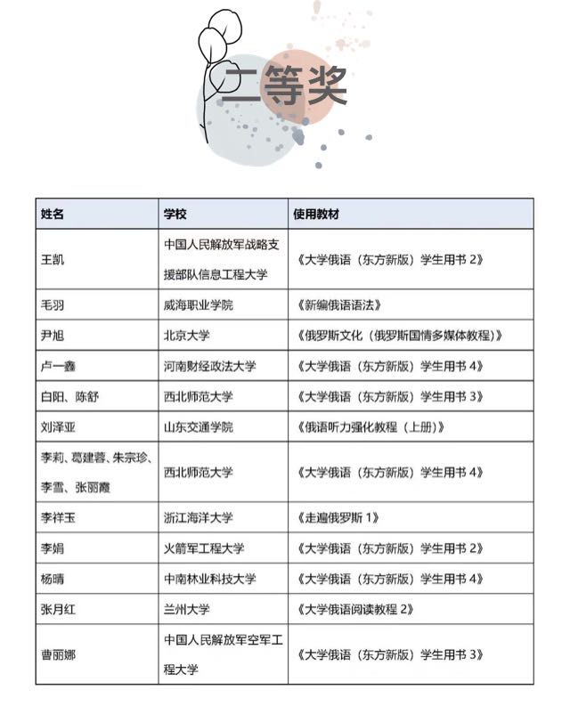 此次比赛评审组从来自全国近70所高校的百余份参赛作品中评出一等奖6人,二等奖12人,三等奖18人。其中参赛作品内容涵盖实践课、语法课、文化国情课、翻译课等多门《普通高等学校本科俄语专业教学指南》规定的俄语专业主干课程及公共俄语、二外俄语课程。