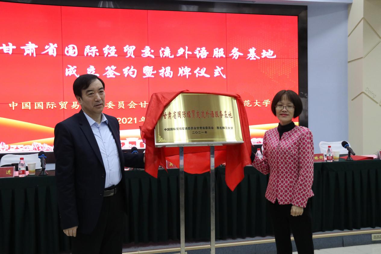 2021年4月1日下午,由中国国际贸易促进委员会甘肃省委员会与西北师范大学共同举办的甘肃省国际经贸交流外语服务基地成立签约暨揭牌仪式在教师发展中心二楼报告厅举行,中国贸促会甘肃省委员会副会长吴丽霞、会展部部长王海滨、国际合作部部长高书乾、项目促进部副部长曹伟宝、国际合作部三级调研员刘新元,西北师范大学副校长田澍、党委组织部副部长周琳辉、党委宣传部部长雷鸣、党委学生工作部副部长苟正斐、教务处处长王治和、社会合作服务处处长杨纳名、创新创业学院常务副院长慕小军、yl6809永利班子成员、系(部/中心)主辅导员、国际经贸交流外语服务基地师生代表参加了此次仪式,本次仪式由yl6809永利院长曹进主持。