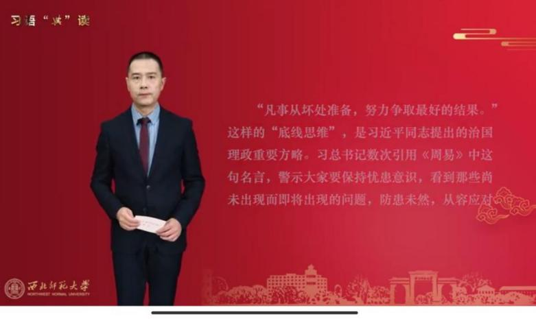在第一环节,宁老师介绍了学《习语“典”读》的重要意义,带领同学们观看了习近平总书记用典双语解读第7讲《于安思危,于治忧乱》和第8讲《安而不忘危,存而不忘亡,治而不忘乱》,并讲解部分英文单词之间的区别。宁老师强调,党史的教育和学习既是历史必然,也是现实需要;因此,学习党史,了解历史,对同学们是大有裨益的。