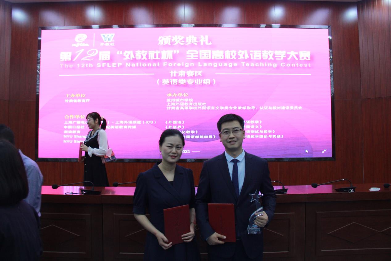 2021年6月18日-6月20日,由甘肃省教育厅、上海外语教育出版社主办的第十二届“外教社杯”全国高校外语教学大赛(英语类专业组)甘肃分赛区比赛在兰州城市学院举行,我院杨保林、陈倩两位老师代表我校参赛。经过复赛和决赛的激烈角逐,最终杨保林老师获得商务英语专业组特等奖、陈倩老师获得英语专业组一等奖。