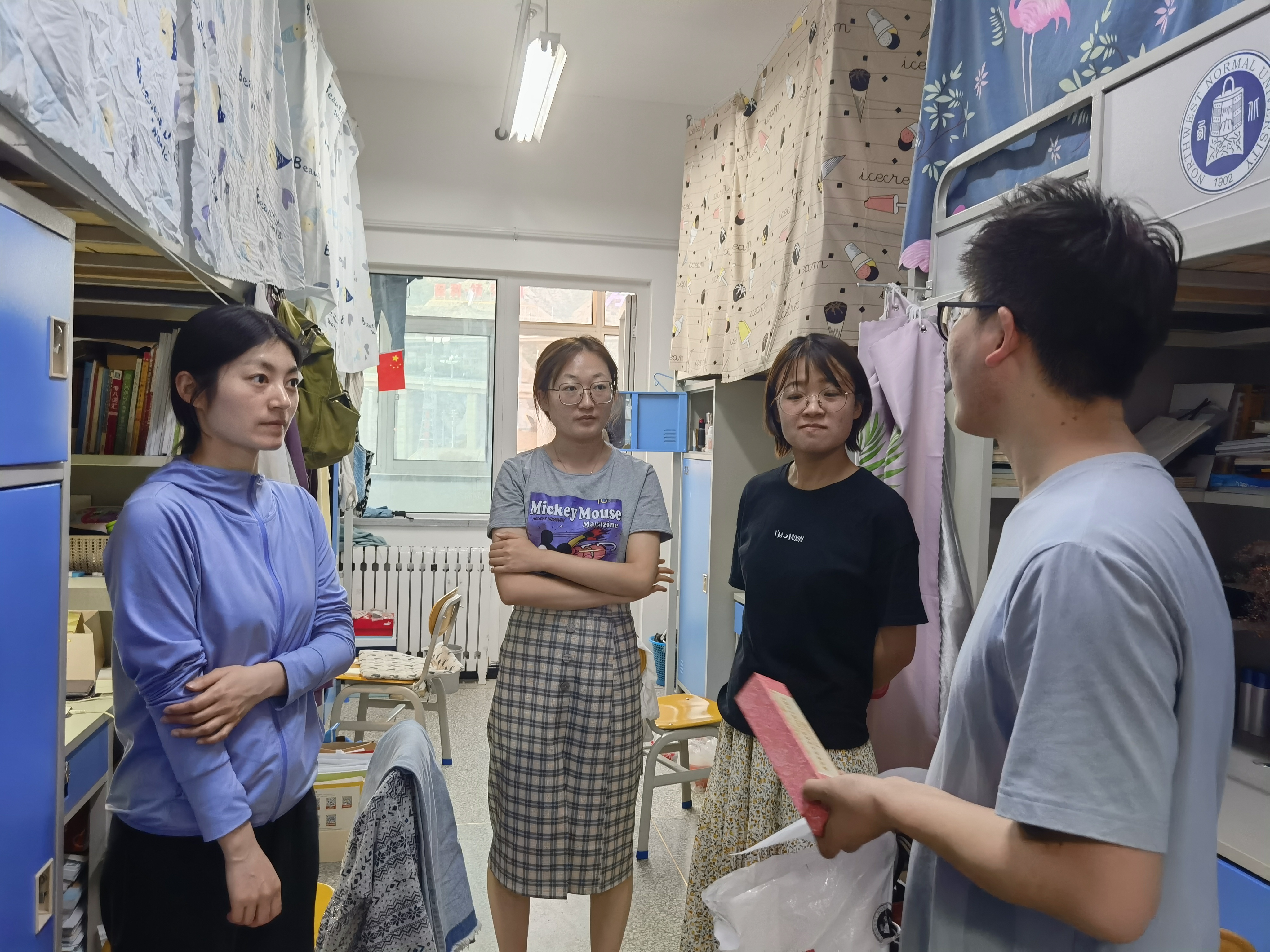 走访过程中,老师们与毕业生温情交谈了大学生活,聆听了同学们的毕业感受,进一步了解了同学们的就业情况,勉励大家要谨记师大“知术欲圆,行旨须直”的校训,在工作岗位上不断历练自己。同时,鼓励未就业学生,树立“先就业,再择业”的就业观念,端正态度,积极就业,提醒同学们在回家的路上注意安全,在离校之前给自己的宿舍“美美颜”,保持公寓干净整洁。