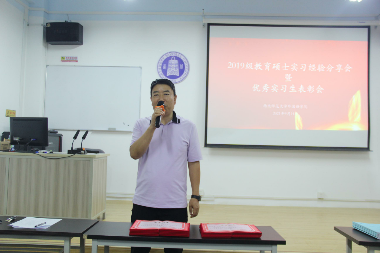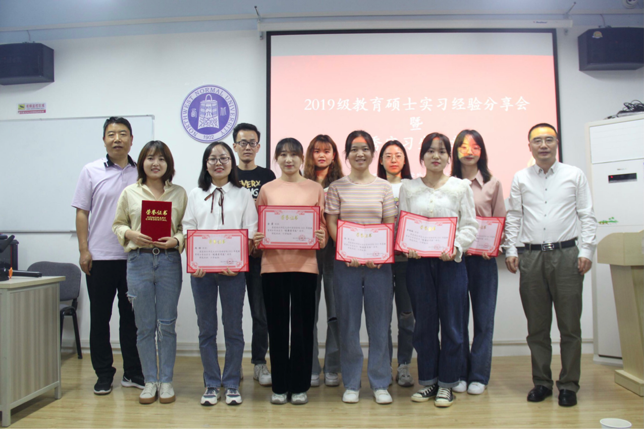 随后,高育松副院长对2019级教育硕士于上学期开展的教育实习进行总结评价,结合实习学校的评价、日常考勤、实习生个人的总结报告等评价标准,宣布评选出的9名优秀实习生为:吴磊磊、赵晗、张璇、蒋雯、张杰、金霞、李春燕、胡凤萍、李韵琳。随后,王景书记、高育松副院长共同为优秀实习生颁发荣誉证书。高院长就实习情况为对全体教育硕士给予了三点建议。第一,提升自己的教学技能。实习的结束意味着毕业、就业的起点,利用这次机会发现自身的不足,利用收获提升自己的教学技能,增加就业竞争力;第二,规范论文写作、提升论文质量、用真实数据精进论文写作;第三,调整好就业心态,树立就业“保底”意识。