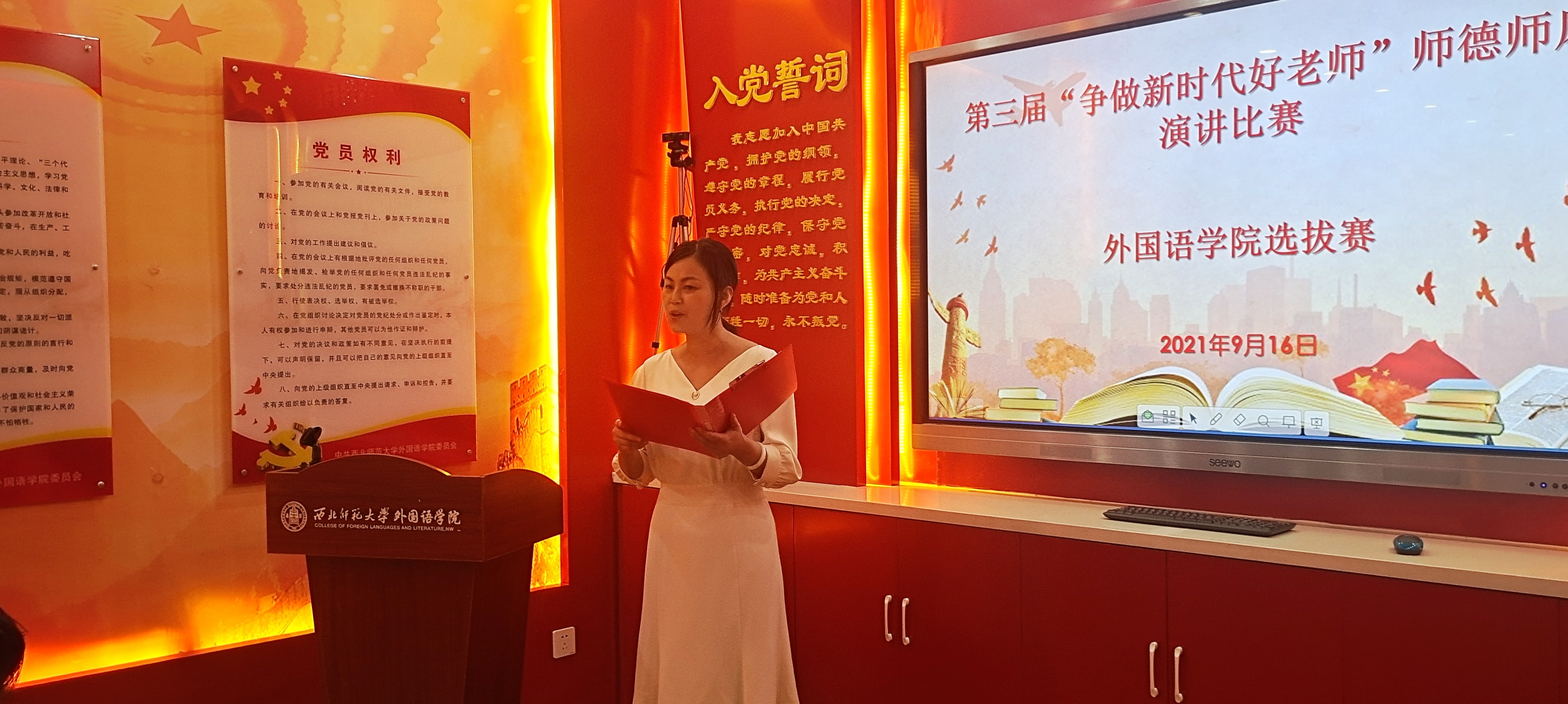9月16日,外语学院举办第三届“争做新时代好老师”师德演讲比赛选拔赛,来自学院5名教师参加选拔赛,学院党委党委书记王景同志和20名学生代表现场观看比赛。