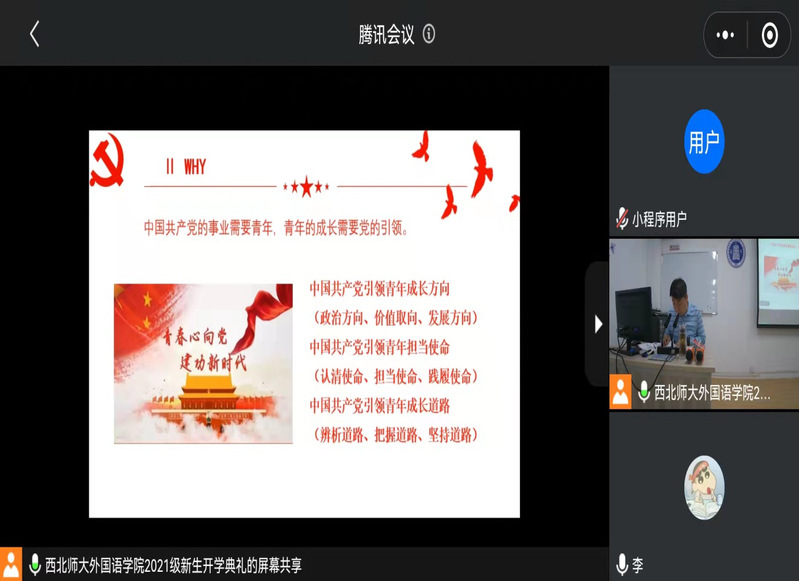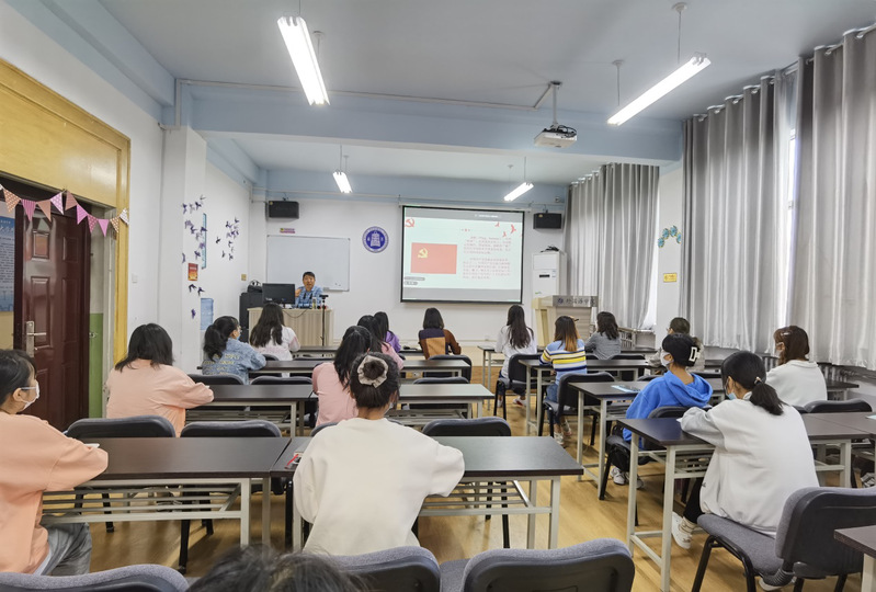 王书记以“我为党旗添光彩”为题,从中国共产党的性质宗旨、青年大学生为什么要加入中国共产党、怎样才能加入中国共产党三个方面作了一场党史学习教育报告,和广大新生同学一起回顾了党的百年历史,希望同学们立足大学学习生活,坚定理想信念,努力提高本领,不断完善自己,以实际行动积极向党组织靠拢,为实现中华民族伟大复兴的中国梦而不懈奋斗。