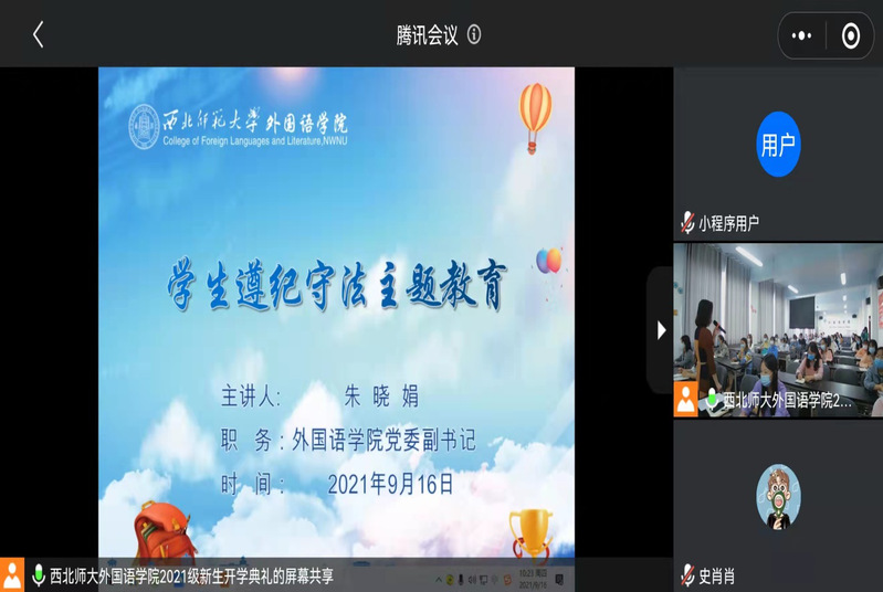 朱书记从高等学校学生日常行为准则,西北师范大学学生违纪处分办法,西北师范大学学生公寓安全管理办法等方面,同时结合学生日常管理中的典型案例对新生做了遵纪守法教育,希望同学们在新的环境中能够尽快适应新的生活,在日常学习生活中能够遵守学校和学院各项管理规定,在新的征程中,创造新的辉煌。最后就新学期疫情防控工作做了详细的安排。