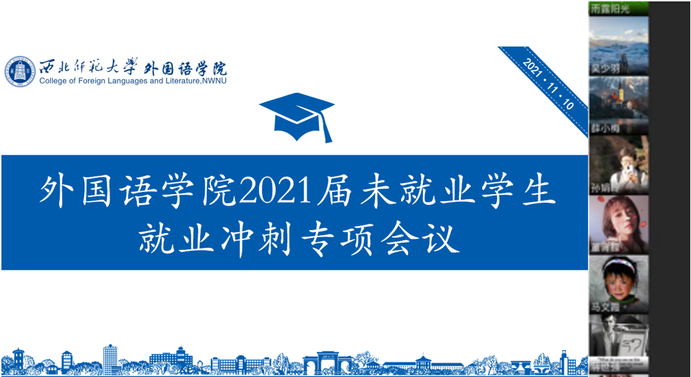 为全力推进2021届毕业生就业工作,yl6809永利于2021年11月10日12:30在线召开2021届未就业学生就业冲刺专项会议,会议由学院党委书记王景主持,2021届未就业学生就业责任人、辅导员等40余人参加了会议。