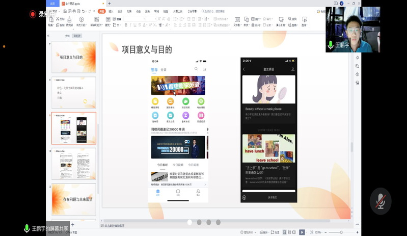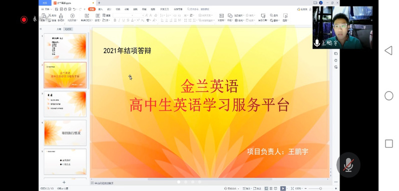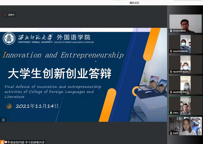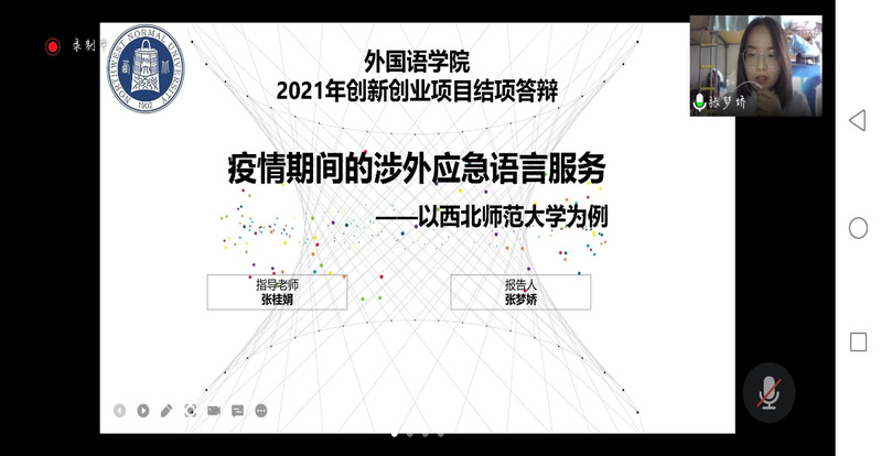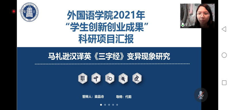 为推进学生“创新创业能力提升计划”进一步实施,11月14日下午,yl6809永利举办2021年课题研究项目、创新创业项目的结项验收答辩,答辩通过线上会议形式进行,共有4个项目参与答辩,各项目组成员共计30余人参与答辩会,答辩邀请到yl6809永利副院长杨保林,日语系系主任曹正霞、翻译系系主任李红霞、翻译系张硕四位老师担任评委。