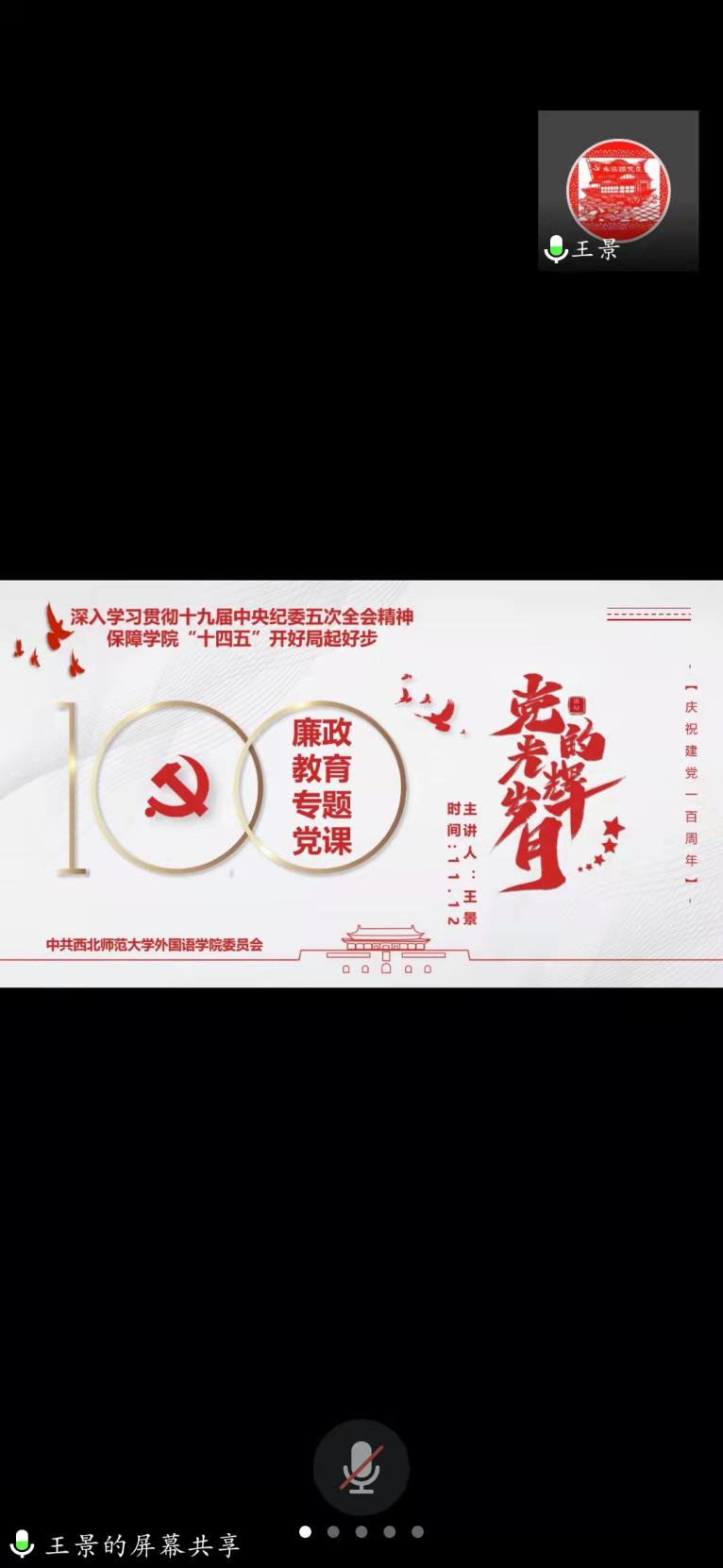 根据学校党委《关于开展廉政教育系列活动的通知》精神,11月12日,学院党委书记王景以《深入学习贯彻十九届中央纪委五次全会精神,保障学院“十四五”开好局起好步》为题,作了一次廉政教育专题党课。