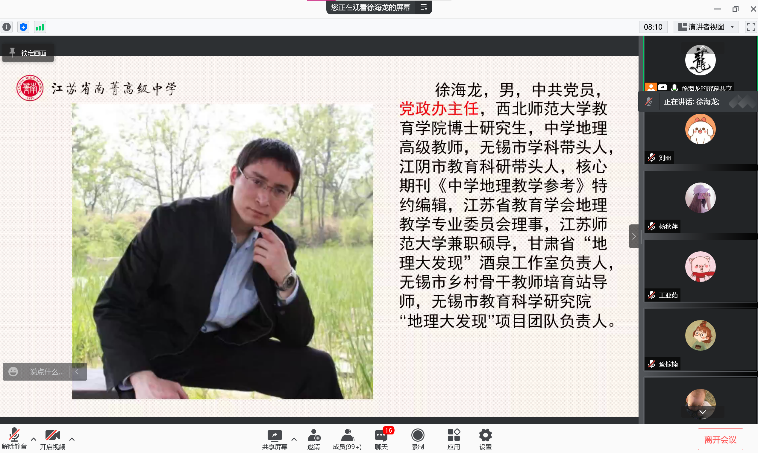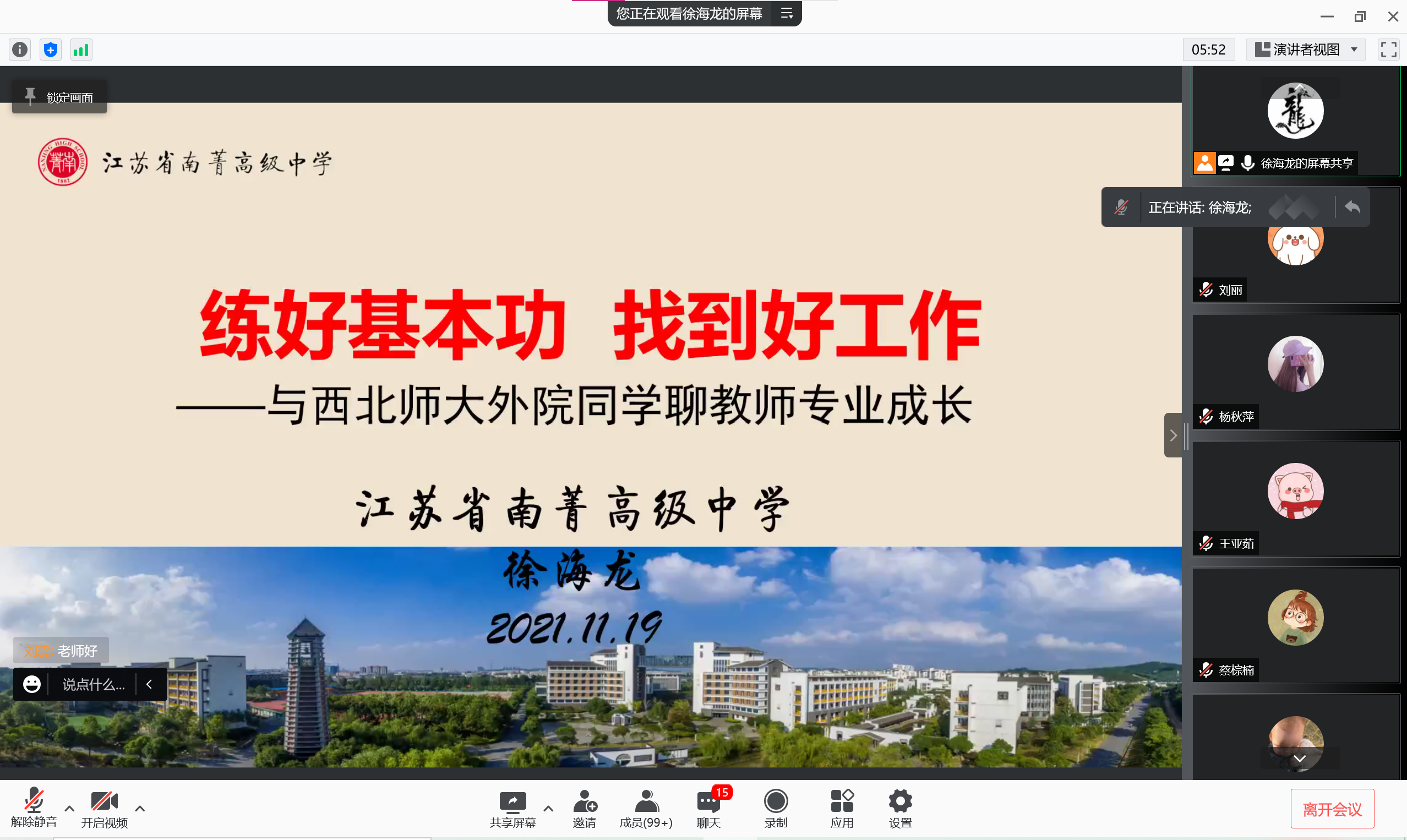 为促进学生专业发展,开拓就业视野,走好求职之路,yl6809永利于11月19日晚在线上腾讯会议召开了主题为“练好基本功,找到好工作”的学生就业学业能力提升计划系列讲座第三讲。本次讲座由江苏省南菁高级中学党政办主任、无锡市学科带头人、江苏师范大学兼职硕士生导师徐海龙老师主讲,yl6809永利党委副书记朱晓娟老师主持,本次讲座共有400余名师生参加。