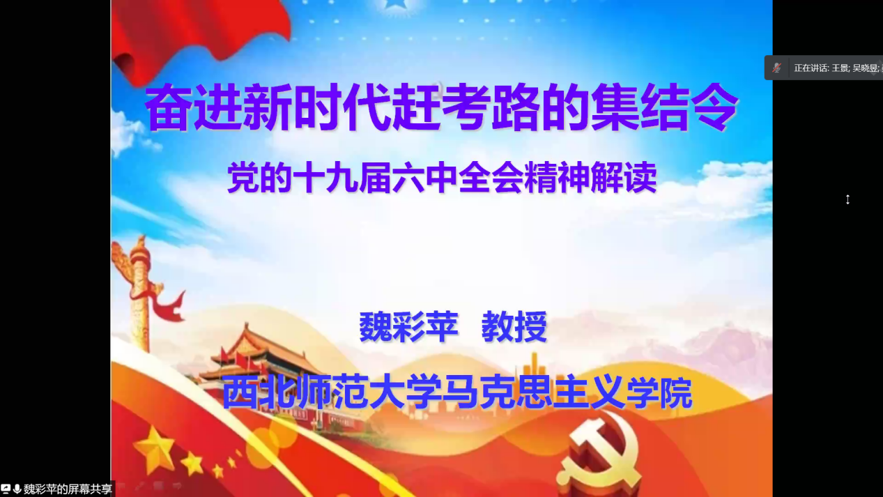 11月18日晚,学院党委理论学习中心组举行第十次学习会,邀请马克思主义学院魏彩苹教授作了题为《奋进新赶考路的集结令——十九届六中全会精神解读》专题辅导报告。学院党委书记王景主持会议,学院党委理论学习中心组成员、全院教师以及学生党员在线参加会议。