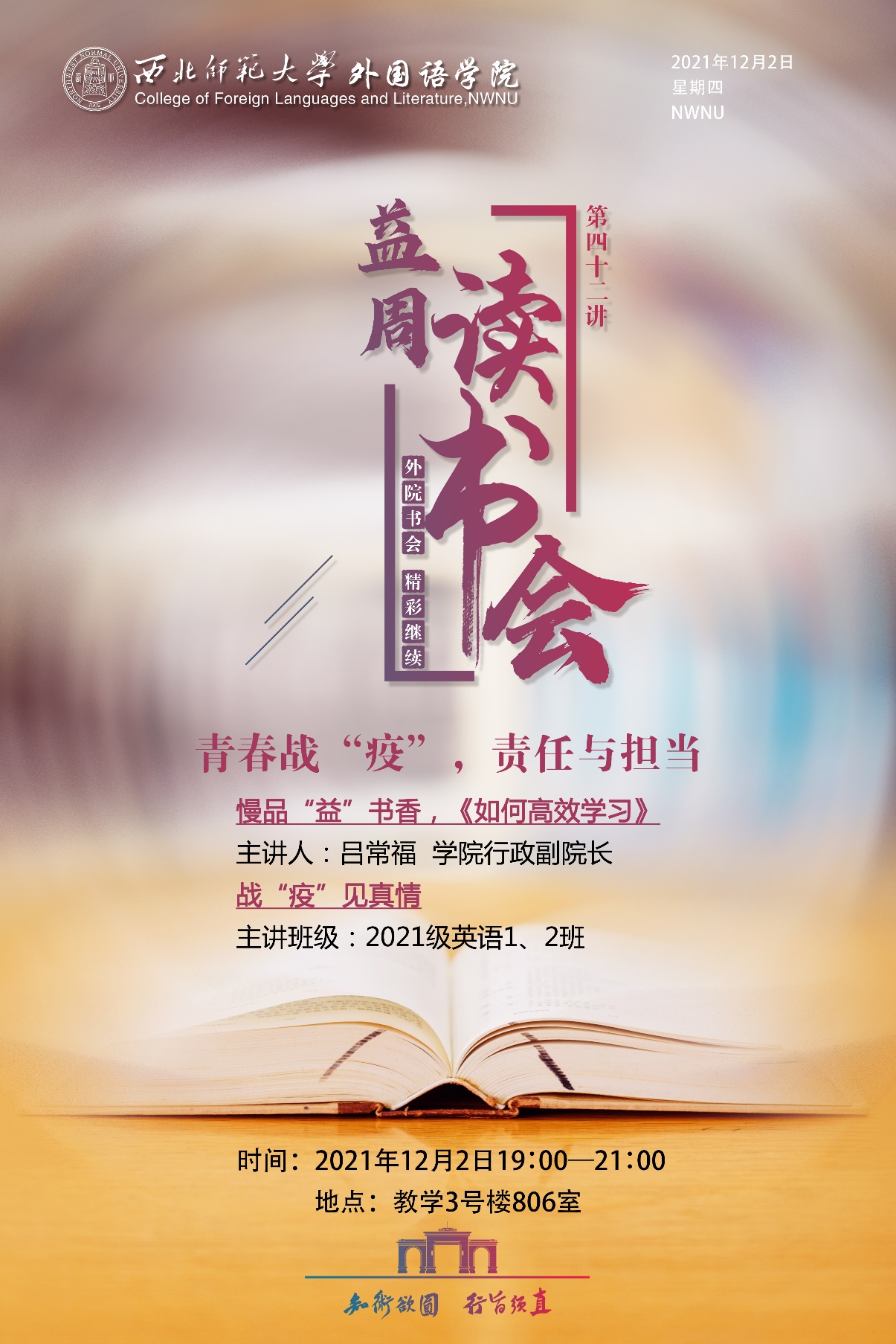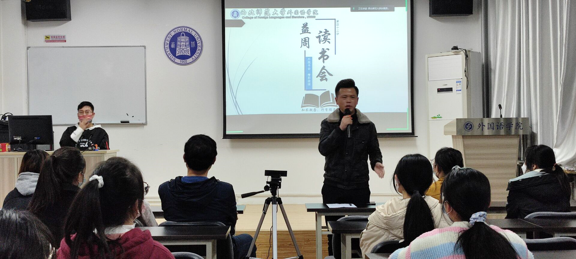 12月2日晚,yl6809永利“益”周读书分享会第四十二期在3教806如期举办,本期读书会邀请到学院副院长吕常福担任主讲,辅导员张碧全老师主持,2021级英语1、2班参加线下分享,其余班级通过线上形式参与,共计300余人参加了分享会。
