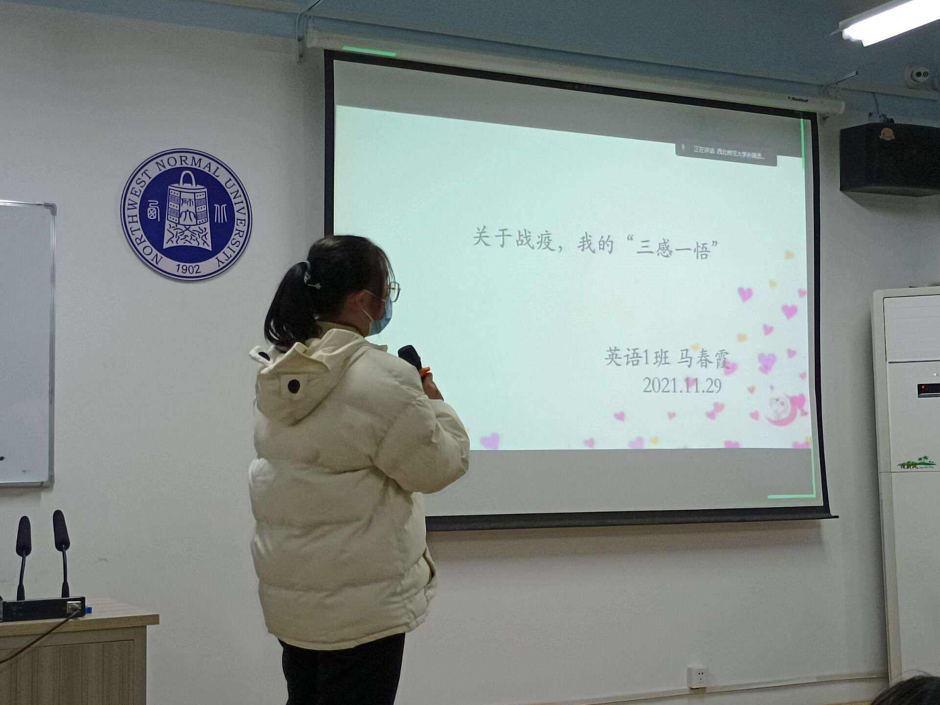 分享会第二环节,结合图书感悟,班级代表围绕“青春战役,责任与担当”主题进行了分享交流,班级分别通过视频展播的方式对抗疫期间的学习生活进行了记录分享,马春霞同学分享了疫情期间自己的“三感一悟”,并表示,一定会珍惜来之不易的抗疫成果,在今后的学习生活中践行青年一代的初心和使命。