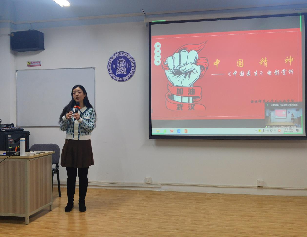 分享会第一环节,班级代表分别通过回忆影片经典人物的感人事迹对推荐影片《中国医生》做了观影分享。随后梁海英老师结合以上同学的分享也分别从影片简介、中国精神和青春战“疫”这三个方面与同学们分享了自己的感受,总结诠释了中国精神之奋斗精神、奉献精神以及团结精神,鼓励同学们传承好中国精神,用自己的学识奉献广大人民群众,让青春的涓流朝着党旗所指的方向奔涌。