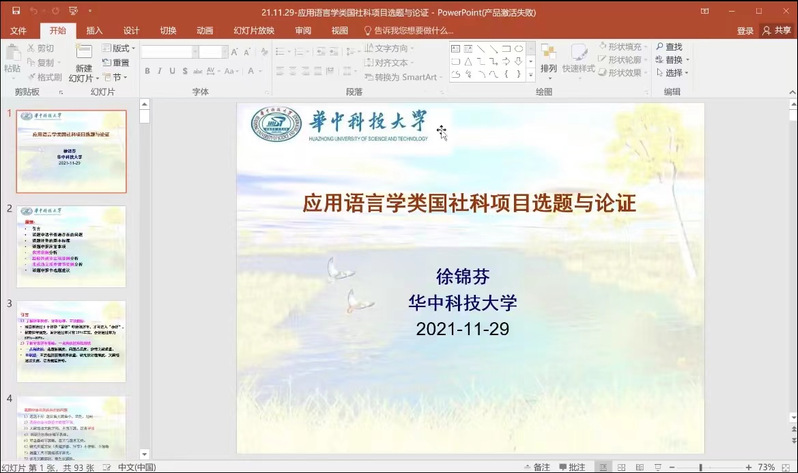 11月29日晚,华中科技大学博士生导师徐锦芬教授应学院邀请,通过腾讯会议,为我院教师做了题为“应用语言学类国家社科项目选题与论证”的在线讲座。徐锦芬教授是国务院政府特殊津贴专家、中国二语习得研究专业委员会副会长。主持3项国家社科重点项目1项、一般项目2项。徐教授围绕国家社科项目评审指南解读、选题、论证等内容,为广大教师申报国家社科项目提供了非常有益的指导。