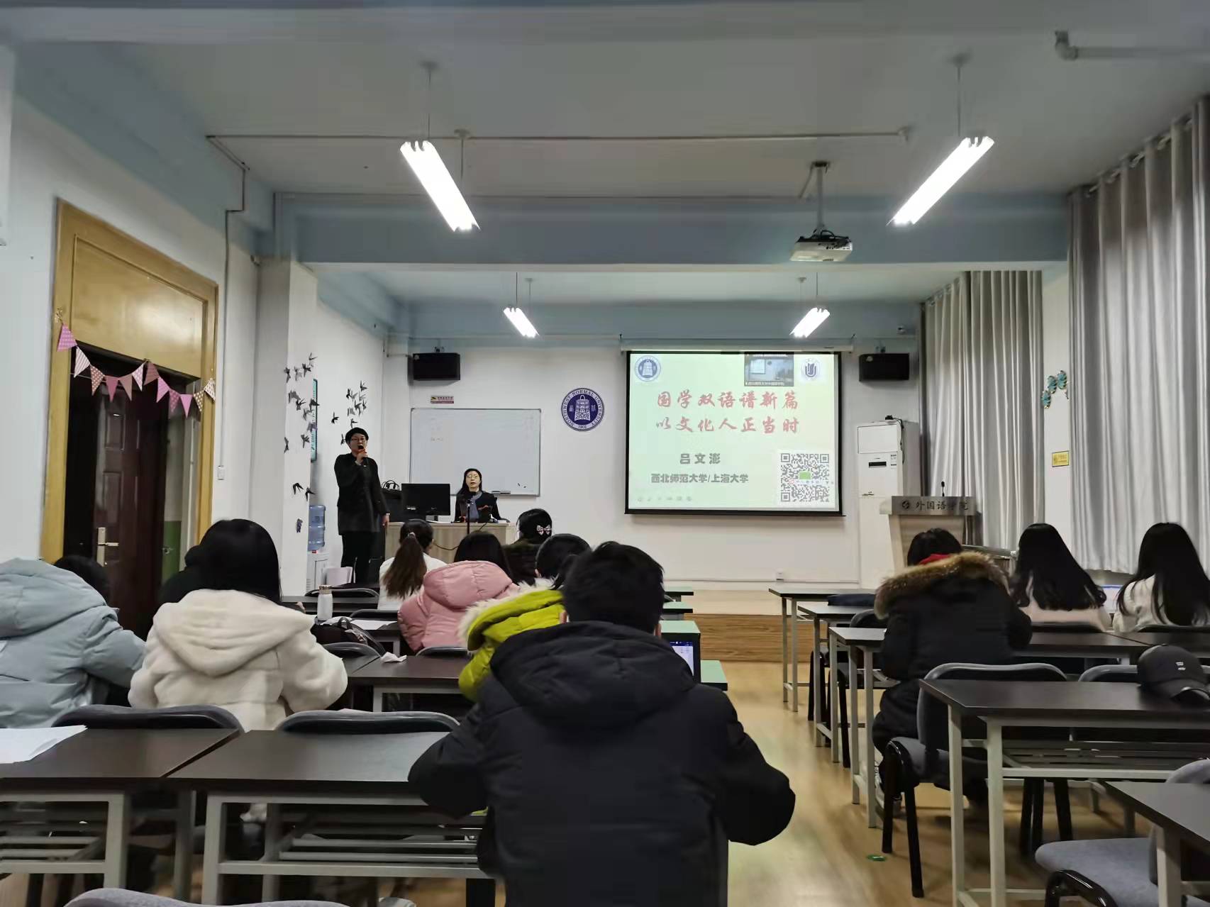 兰山阴岭秀,积雪浮云端。2021年12月10日下午,yl6809永利党委委员、教工第一党支部书记吕文澎副教授为我院师生作了“国学双语谱新篇,以文化人正当时”的专题党课。党课采取线上线下相结合的方式进行,教工第一、二、三党支部教工党员代表及学生百余人在现场参加。党课由教工第二党支部书记吴晓煜副教授主持。