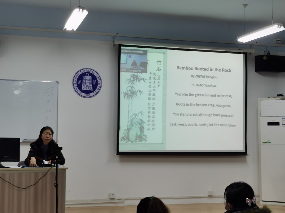 党课伊始,吕老师分享了“唐宋双语”公众号李白《黄鹤楼送孟浩然之广陵》的双语视频,并介绍说,这是唐山东方国际学校小学部的学生多情演绎、由20多位专家多媒体多模态倾力打造的,是“古为今用,古今结合”的典例,这种全新的艺术表现形式有助于推动中华优秀传统文化的创造性转化、创新性发展,以时代精神激活中华优秀传统文化的生命力。然后,吕老师通过自己在赵彦春教授指导下访学期间赴唐山东方国际学校参加国学双语教学的典型案例,介绍了国学双语教育的现状与进展。吕老师还阐释了“国学”与“国学双语教学”的概念和内涵,向大家阐明了思政元素的分类,以及双语古诗中所蕴含的思政元素。她认为,在外语专业课程思政建设中,既要概括、提炼教学内容中的思政元素,又要润物无声融入思政元素。吕老师以古诗双语教学为例,向大家讲述了实施外语课程思政的重要意义、方法途径,建议通过双语古诗配画等形式来美化校园环境,提升文化氛围。