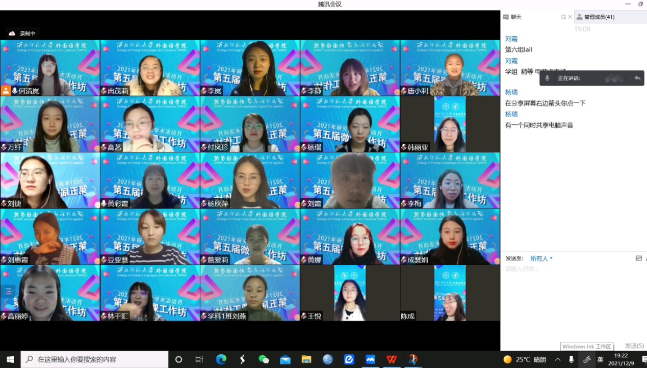 2021年12月9日晚,yl6809永利举办了第五届微课工作坊:“优秀微课展示与分享”活动。工作坊指导教师黄彩霞、2021级全体英语学科教学和课程与教学论专业研究生参加了本次活动,2020级本硕一体研究生何清岚主持。