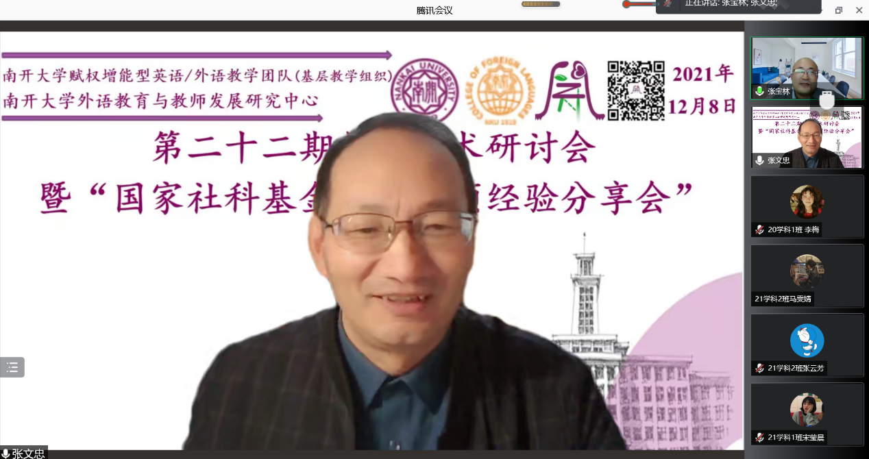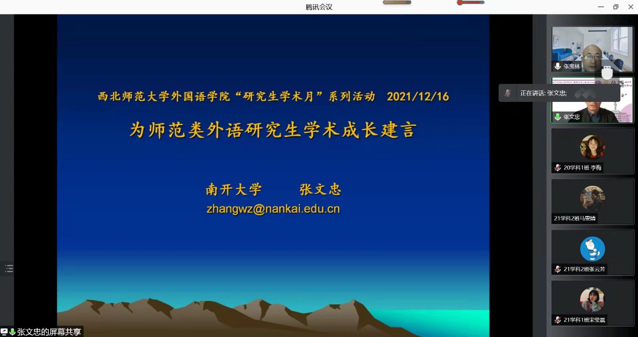2021年12月16日晚,yl6809永利特邀南开大学yl6809永利教授、博士生导师张文忠教授在线为我院师生作了“为师范类外语研究生学术成长建言”的线上学术讲座。本次讲座由yl6809永利副院长张宝林教授主持,学院部分教师及2021级教育硕士聆听了此次讲座。