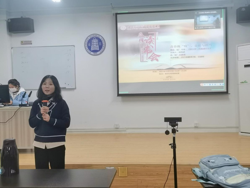 2021年12月17日晚,yl6809永利“益”周读书分享会第四十六期在教学3号楼806室如期举办。本期读书会邀请到学院林凤娇老师担任主讲人,2021级翻译2班、日语班参加线下分享,其余班级通过线上形式参与,共计300余人参加了此次分享会。