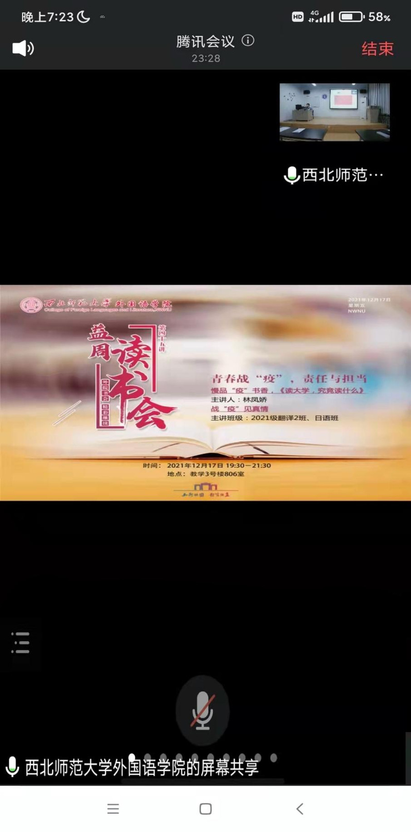 分享会第三环节,战“疫”见真情。结合读书感悟,各班级代表通过演讲、录制视频、朗诵诗歌等方式分享了他们在疫情中的志愿经历和感悟,“责任于心,担当于行,春风化雨,润物无声”,他们铿锵有力的声音,为本次读书会画上完美的句号。