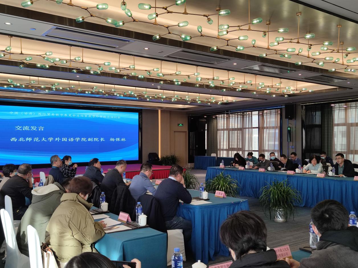 2021年12月21日,杨保林和郭亚文受邀参加中国(甘肃)国际贸易数字展览会总结暨数字外贸能力培训会。此次会议由省贸促会马学礼会长主持,省贸促会会展部负责人介绍了展览会的组织情况和取得的成绩,充分肯定了我院及甘肃省国际经贸交流外语服务基地进行的“直播带货”外语语言服务工作。杨保林代表甘肃省国际经贸交流外语服务基地在会上做了交流发言,表示学院会以基地为平台,密切联系省贸促会,为我省经济社会发展贡献更大力量。省贸促会、省商务厅、省政府国资委领导,市州商务、贸促会负责人与参展企业负责人等近百名代表参加此次会议。