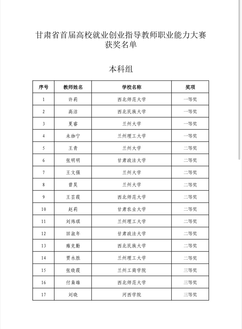 为贯彻落实党中央、国务院“稳就业”“保就业”决策部署,展现我省高校就业创业教师风采,搭建相互交流平台,提升教师能力水平,甘肃省教育厅于2021年12月22日、23日在兰州理工大学举办“甘肃省首届高校就业创业指导教师职业能力大赛”。经学校初赛、省级初赛和省级决赛,我院专职辅导员王芸霞荣获甘肃省首届高校就业创业指导教师职业能力大赛二等奖。