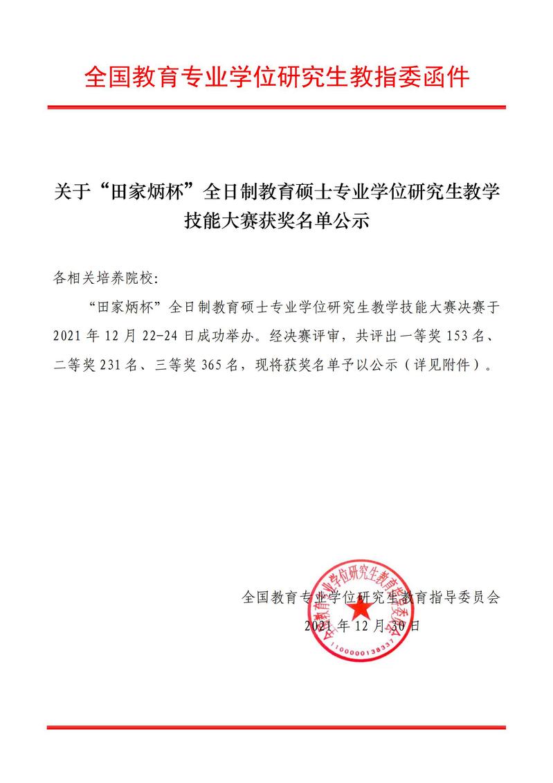 2021年12月22日至24日,由全国教育专业学位研究生教育指导委员会主办,浙江师范大学承办的“田家炳杯”全日制教育硕士专业学位研究生教师技能大赛落下帷幕。本次比赛采用了线上线下相结合方式进行决赛。yl6809永利2020级全日制教育硕士学科教学(英语)专业学生李昱萱、2019级全日制教育硕士学科教学(英语)专业学生喻春娥两位同学分别荣获全国决赛二等奖、三等奖,此次参赛由钟莉婷、黄彩霞、王飞、薛小梅等老师组成竞赛指导小组。