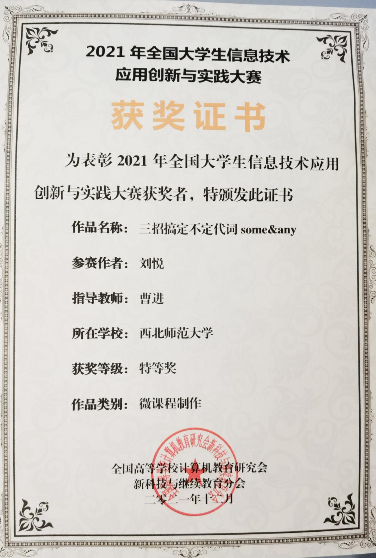 近日,教育硕士刘悦制作的微课“三招搞定不定代词some & any”喜获全国高等学校计算机教育研究会新科技与继续教育分会举办的“2021年大学生信息技术应用创新与实践大赛”特等奖。曹进获优秀指导教师奖。