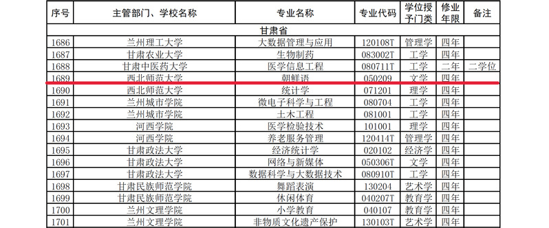 近日,教育部公布了2021年度普通高等学校本科专业备案和审批结果,新增1961个专业点。我院朝鲜语专业申报获教育部审批通过,专业代码:050209,学制四年,将于2023年起招生。朝鲜语专业的成功申报,将进一步促进我院的专业建设和学科发展,为西北地区培养高素质朝鲜语人才。