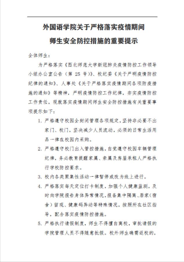 一是认真学习领会《甘肃省全面加强学校疫情防控工作方案》《西北师范大学重大疫情防控应急处置预案》以及省、市、区、学校疫情防控公告精神,提高规范防控、科学防控、精准防控的能力水平。二是结合学院实际,针对短板弱项列出工作重点、具体措施,制定疫情防控任务清单和学院领导责任清单。三是面向全体师生发布《yl6809永利关于严格落实疫情期间师生安全防控措施的重要提示》,坚持师生每日定位打卡、视频打卡制度,要求师生做到守土有责、守土负责、守土尽责。四是覆盖全体师生,分级分类召开全院教工会、党支部书记会、班主任会、研究生导师会、本科生会、研究生会、党员会、赴外读博访学教师会、未返校学生走读学生会,强调防控要求,严明防控纪律。五是学院领导下沉系部,带头宣讲防控政策,层层压实工作责任。六是加强在线教学监督检查,认真听取师生意见建议,维护教学纪律,保证教学质量。六是根据学校统一安排,认真组织全体师生进行核酸采样,排摸防控风险。七是分类建立专属服务群组,针对隔离留观、看病取药、应聘择业、考研调剂、复试准备、论文撰写、材料政审、对外交流等师生和离退休教工,点对点进行指导交流,及时关注特殊需求,悉心开展谈心谈话,加强心理关怀疏导,协调有关方面提供帮助支持。八是根据学校工作需要,积极选派学院领导参加学校本部、知行校区、党校公寓、兰天公寓防控工作,配合学校加强校园封闭期间校区内部的师生管理服务。大力倡导党员干部、专任教师、学生骨干积极参加应急语言服务、学业辅导、就业指导、心理疏导、值班执勤、核酸检测、配餐送餐等志愿服务工作。九是统筹安排校内居住的学院领导、行政教辅人员在岗带班值守,及时处理学院日常事务。十是精准排摸师生特殊情况,及时报备相关异动信息。