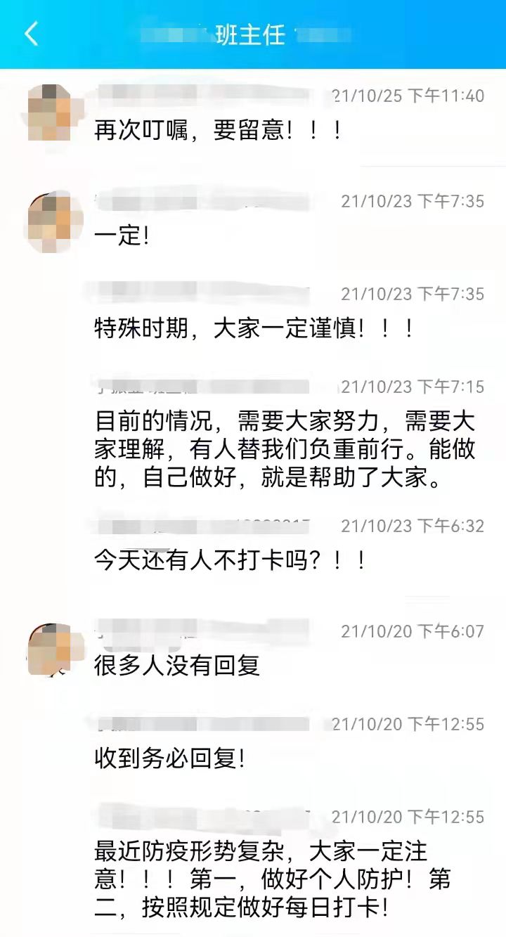 落实网格化管理,坚守安全底线。班主任严格落实“学院—辅导员—班主任(研究生导师)—班委—学生”的纵向微信网格和“舍友—宿舍互助发展引导员—班委—班主任—辅导员—学院”横向微信网格管理模式,全员在岗、全天在线,督促每日每位学生“日报告、零报告”,动态掌握学生情况。同时,坚持每日在各年级班主任工作群反馈班级情况,做到全覆盖关爱学生,坚守学生安全底线。