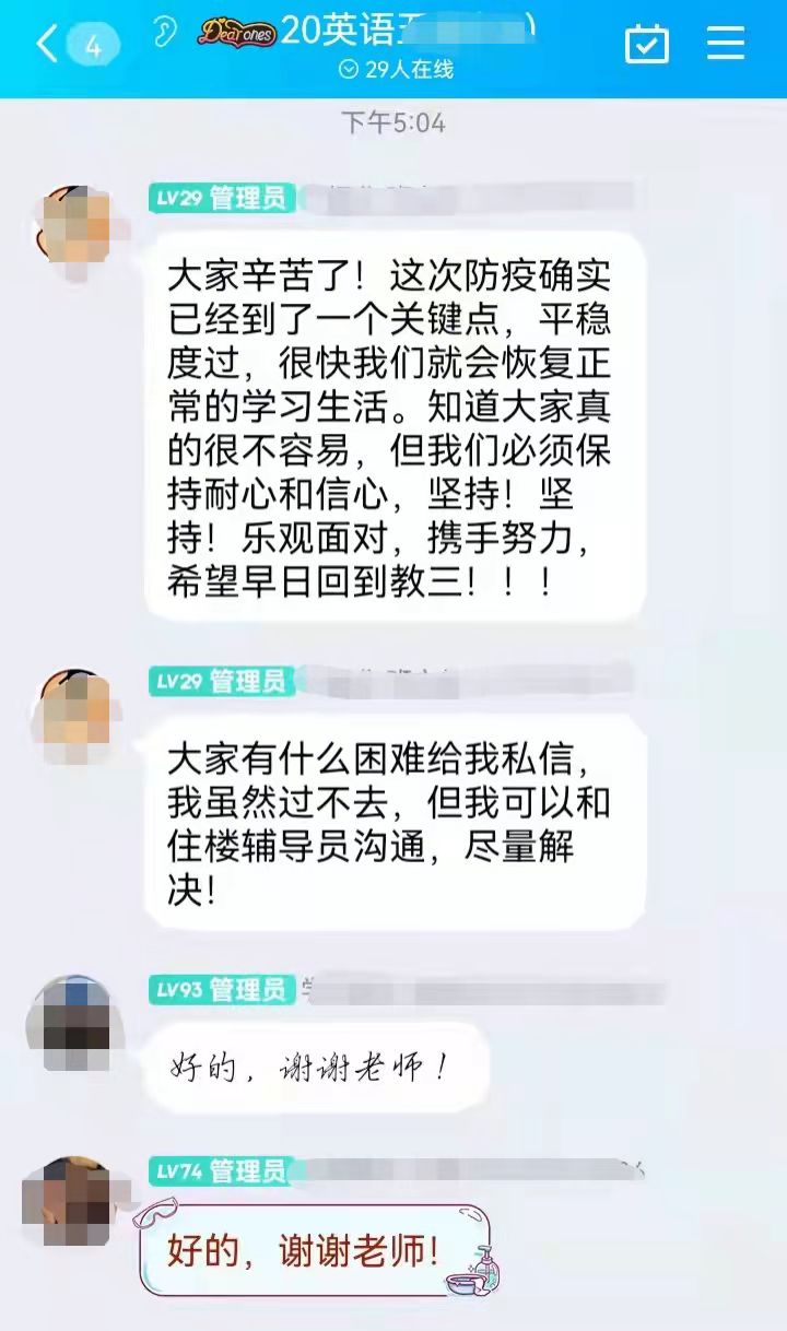 戴好“思想口罩”,筑牢抗疫“心”防线。本科生43位班主任老师兢兢业业,关爱学生,全力保障学生的学习、生活顺利进行,凝聚着携手抗疫的外院力量。“同学们,在封校期间一定要做好自我防护,遵守学校防疫规定,携手共进,共克难关,‘我’一直都在,为你们保驾护航”,2020级英语5班班主任宁振业老师在班会上的话语一直回荡在同学们的脑海中。疫情期间,宁老师通过云平台引导学生坚定信念,树立信心,遵守规定,共克时艰,戴好“思想口罩”,做新时代的好青年。2021级英语5班班主任王芸霞老师每晚以视频打卡的方式掌握学生动态,以聊天、做小游戏、拍小视频等方式增进班级团结,与学生逐一通过微信、QQ、电话交流,缓解学生紧张、焦虑情绪,积极进行学生心理疏导,在云端守护班级学生,筑牢抗疫“心”防线。