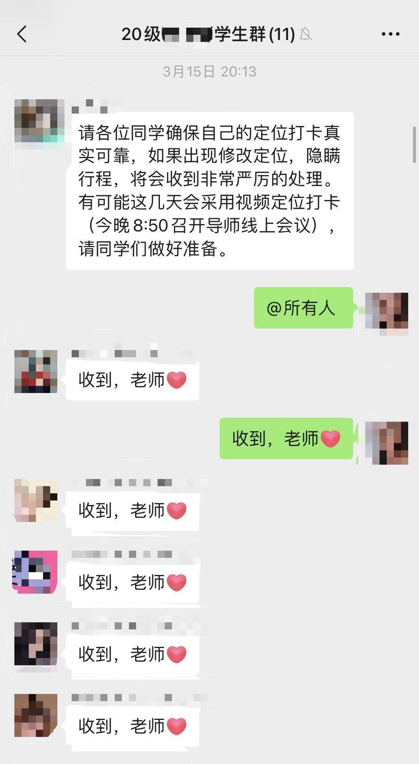 无微不至是导师,学习安全两不误。自抗击新冠肺炎疫情以来,学院导师三年如一日地严格落实“日报告、零报告”制度,按照学生每日在班级群定位打卡、导师汇总后反馈在导师群、再由辅导员汇总后上报学院的工作流程,督促学生每日健康打卡。同时,导师们及时将学校、学院的相关通知、要求传达给学生,并强调重点事项,时时给予学生心理、就业、安全、成长等方面的指导与帮助,全心全力保障学生安全底线。