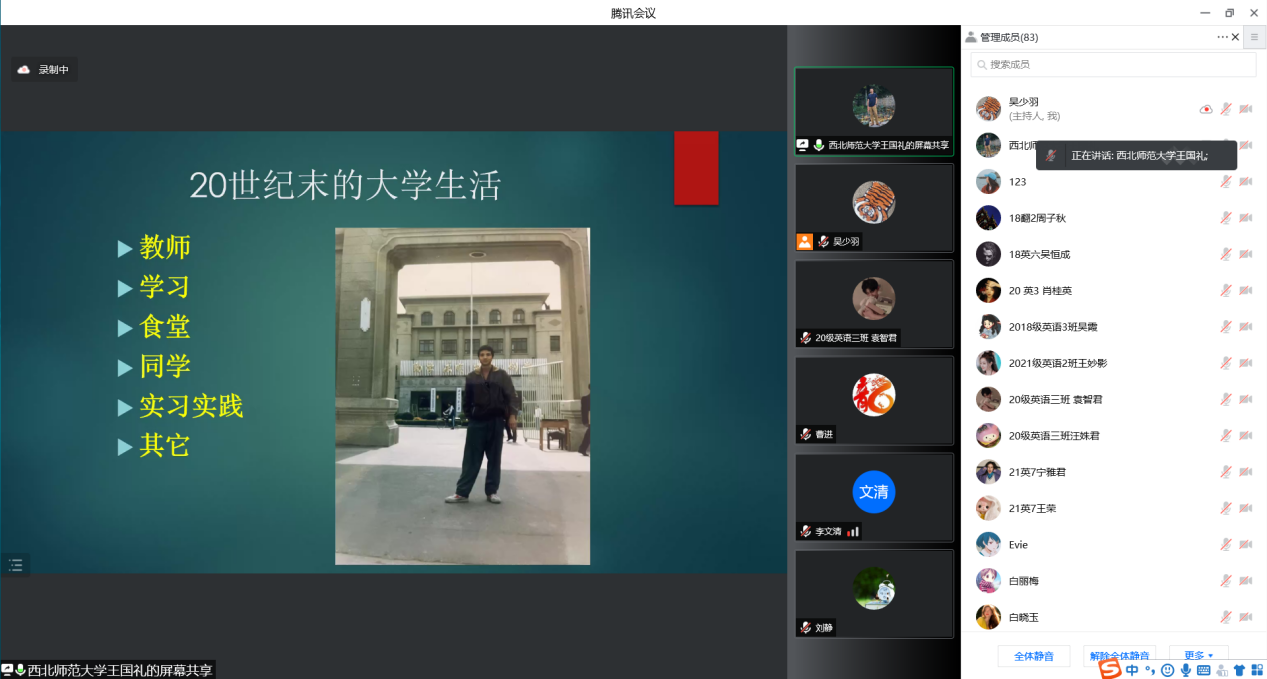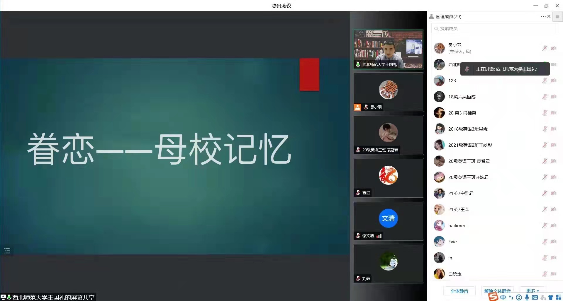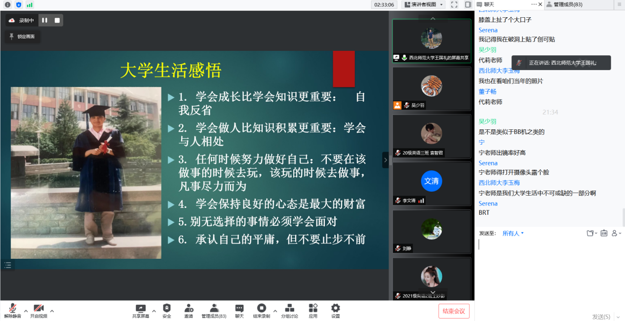 王老师用初入学时与母校的一张合影,将大家的思绪牵引至20世纪末:旧文科楼前,授课恩师们一丝不苟地检查着英文单词;核桃树下,同学们一遍遍地背诵《新概念英语》;宿舍楼里,楼管大叔热情地呼唤着某某某接听电话;在舟曲实习,老师与同学们同吃同住,共同成长;那些拿着传呼机的骄傲,追求意中人未成功的失落,永远专注于“天仙居”的美食……一时间,记忆的洪潮勾起了所有人对母校的感念,在线师生的话匣子被打开了,大家你一言我一语,互动活跃。恩师曹进、白丽梅、宁振业等老师温情诉说当年“严厉”背后的期盼,同班同学兼同事的李玉梅、刘莉、孙歆宇等老师感恩母校带给她们陪伴一生的美好回忆,已毕业学生冯志鑫、胡雅茹、董子畅、陈芊羽从“云端”回到母校怀抱,纷纷表达对母校的思念、对授业恩师的感谢,并向同学们传递志愿服务精神的快乐。师生们直呼“这场聊天会,太有意义了!母校,我们爱您!”