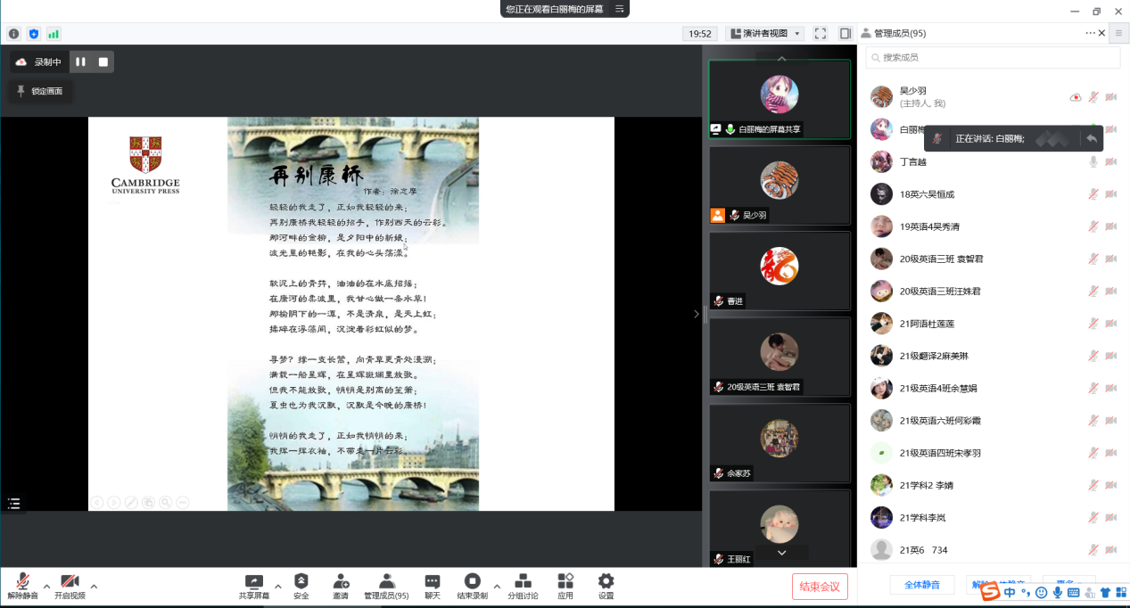 “轻轻的我走了,正如我轻轻的来;我轻轻的招手,作别西天的云彩”,白老师以诗人徐志摩的《再别康桥》开场,瞬间拉近了师生与剑桥的距离。在白老师的分享中,剑桥的美不仅是诗中的“金柳”“青荇”,也是源远流长的学院历史、藏书丰富的图书馆、流连忘返的校园风光、独具特色的食堂,更是古老与年轻、深邃与平和、优雅与随意、紧张与舒适、传统与先进的传承融合。聊到在剑桥生活的有趣故事时,师生们更是兴奋,你一言我一句的停不下来。尤其白老师讲述自己被反锁于住宿楼外,让师生们猜一下自己是如何进去时,大家纷纷“献策”,聊得不亦乐乎。