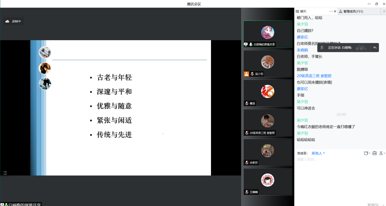 最后,白老师以“心怀梦想,路致远方”勉励同学们学无止境,勇攀高峰。本期聊天也在满屏的“谢谢各位老师们,真的太喜欢这个活动啦,期待老师们下期的精彩故事!”的呼声中圆满结束。
