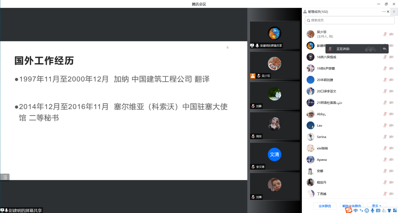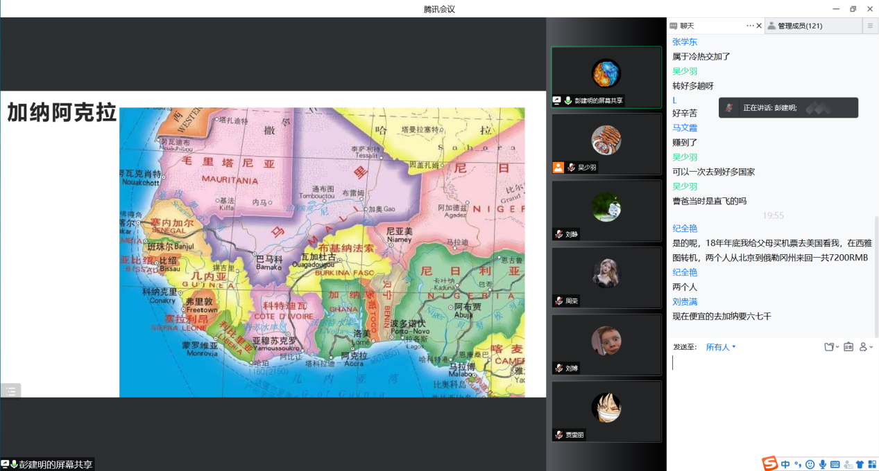 彭老师开门见山,以两张地图带大家认识加纳以及塞尔维亚(科索沃)的地理位置,结合当地的气候、人文环境等讲述了自己如何从一名教师转换成一名翻译的经历及趣闻。正如彭老师在云端分享的那样,初入他国,总是有种淡淡的不适和孤独,渐渐地,这种愁就消散了。在非洲工作的两年,从西非横跨西巴尔干,是一份独特的经历。这里不仅仅是他曾经工作的地方,更是人生的一种积累和沉淀。师生们在云端也惊叹于这种历险,纷纷与彭老师互动,好奇着彭老师精彩的人生履历。