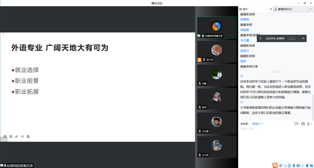 在会议的最后,彭老师敦敦教诲道:少年风华正茂,意气方遒,正当逐梦之年。勉励同学们在最美好的岁月应该好好学习,不负师恩,筑梦未来。也正如彭老师最后提到的“外语专业 广阔天地大有可为”,鼓励外院学子要做好职业选择,坚定职业自信,为讲好中国故事、传播好中国声音贡献自己的力量。