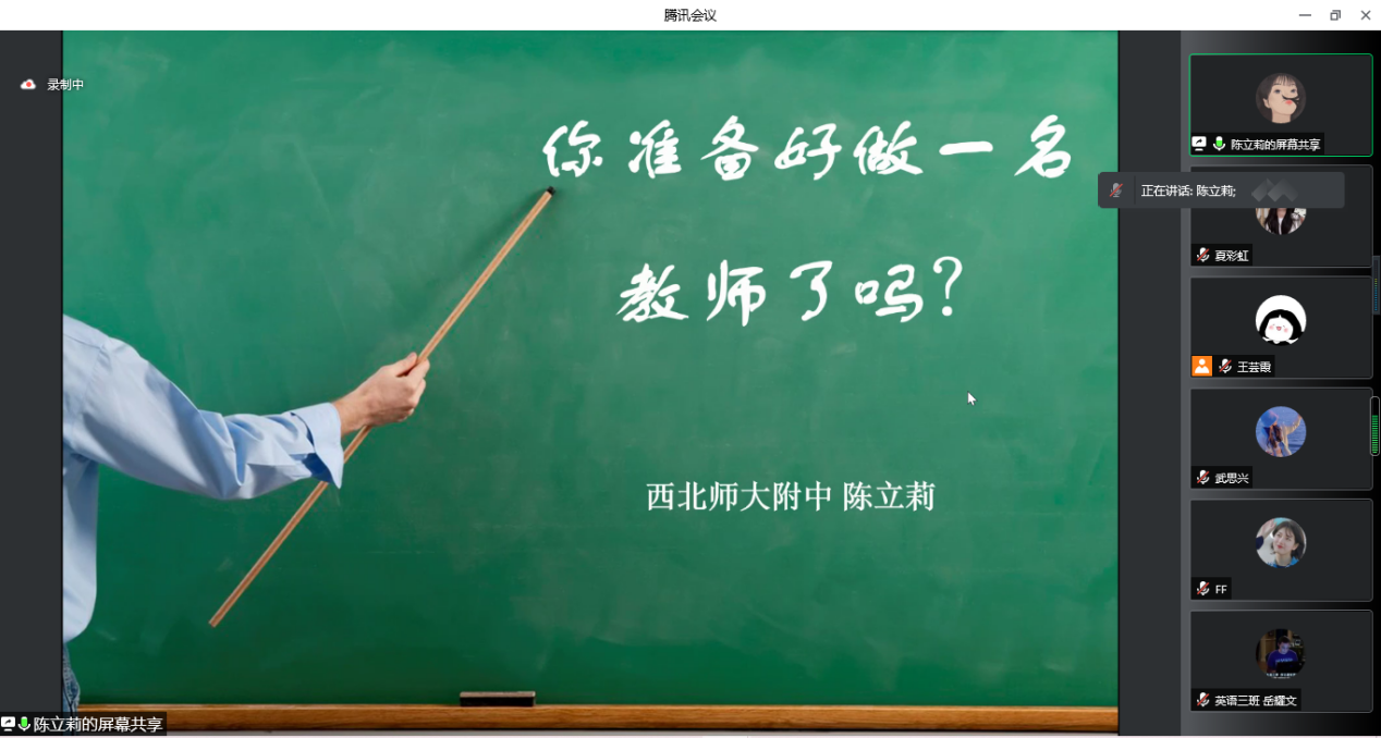 讲座伊始,陈老师用四个数字概括个人四年的从教经历,并借此引出一名优秀教师的必备技能:授课和讲课。陈老师用个人教授的三堂课例,为同学们讲解了教学设计、授课、说课和新教材研读四方面的内容。就教学设计而言,陈老师强调利用学科优势,通过表格的形式呈现所有内容,突出重点。针对如何授课,陈老师通过分享教案、课件与赛教视频,指出教学活动应环环相扣、紧密衔接才能更好达到教学目标。针对如何说课,陈老师围绕“说教材、说学生、说教学目标、说教学理念、说教学过程、教学反思”六大核心要素,通过具体课例展开详细讲解,层次分明,逻辑清晰。就新教材分析部分,陈老师以北师大版高中英语教材Unit6 THE ADMIRABLE为例,梳理单元模块,分析要点。互动环节,陈老师详细解答了同学们提出的关于新课导入、活动设计、课堂实施情况等问题。