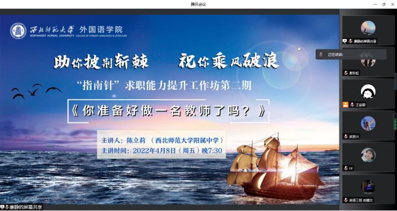 榜样先行,朋辈引领,为助力我院学子实现三尺讲台梦想,yl6809永利于4月8日晚成功举办“指南针”求职能力提升工作坊第二期。学院2018届优秀研究生、西北师范大学附属中学青年教师陈立莉老师应邀作了题为《你准备好做一名教师了吗?》的讲座,近300名师生聆听本次讲座。