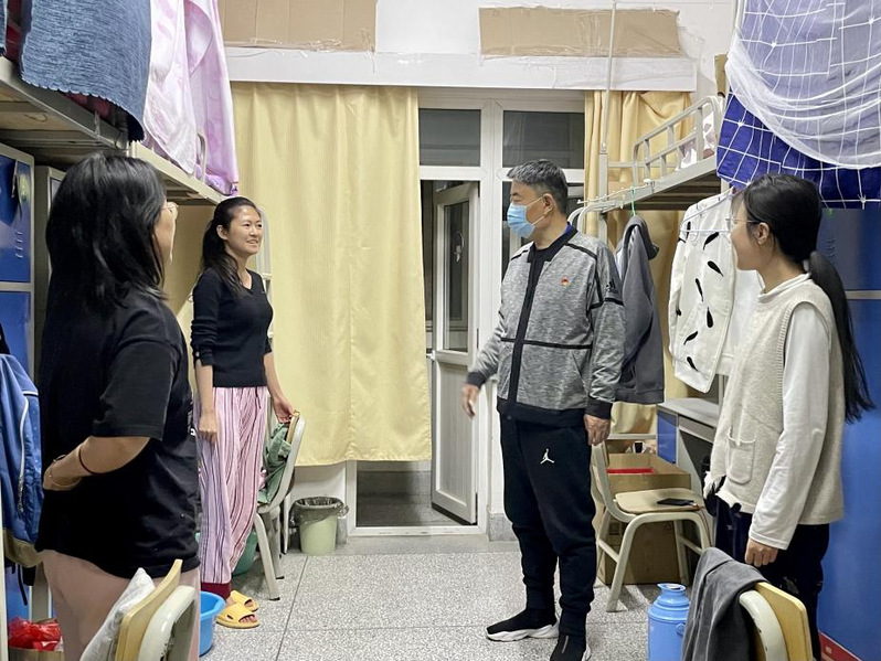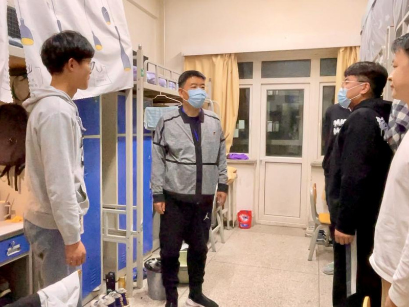 走访过程中,王景书记就同学们的生活、学习以及思想状况进行关怀与慰问。首先,王景书记对学生宿舍卫生进行检查,对整洁有序的宿舍予以肯定与表扬,倡导同学们养成良好的生活习惯。同时,王景书记与同学们亲切交谈,询问大家近期线上教学情况,鼓励大家勤思考、多钻研。此外,王景书记提醒大家务必做好自身防护工作、保持良好心态,如有任何问题,应积极寻求辅导员与导师的帮助,学院将为大家排忧解难,与大家共渡难关。